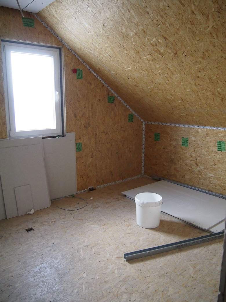 Bei diesem Umbau lag ein grosser Augenmerk auf ökologischer und nachhaltiger Bauweise. Es handelt sich um einen Holzrahmenbau, die Dämmung ist aus Zellulose und Holzweichfaserplatten. Die Holzweichfaserplatten wurden sowohl innen als auch aussen als Putzträger eingesetzt. Im Inneren wurde aussschliesslich mit Lehm verputzt, ausser im Bad, in dem ein Kalkputz verarbeitet wurde.